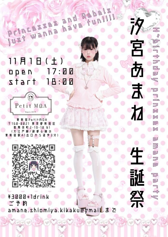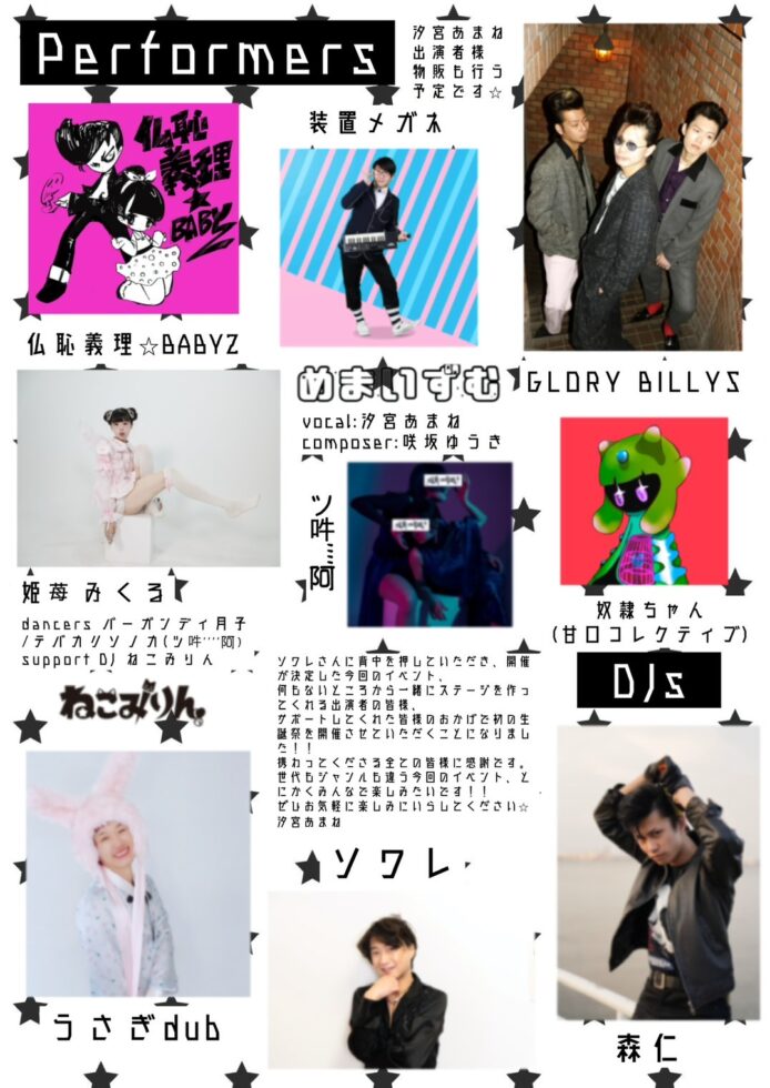 17:00〜17:30 DJstrawberrymilkchan 18:00 汐宮あまね挨拶, ステージスタート 18:00〜18:15 装置メガネ with 姫苺みくる 18:15〜18:35 DJ 奴隷ちゃん 18:35〜19:00 仏恥義理⭐︎BABYZ 19:00〜19:20 DJ ソワレ 19:20〜19:35 ツ吽””阿 19:35〜20:05 めまいずむ 20:05〜20:25 DJ うさぎDub 20:25〜20:45 Groly billeys 20:45〜21:10 DJ 森仁 21:10〜21:40 姫苺みくる 21:40 汐宮あまね挨拶 21:40〜22:00 DJ サミーちゃん