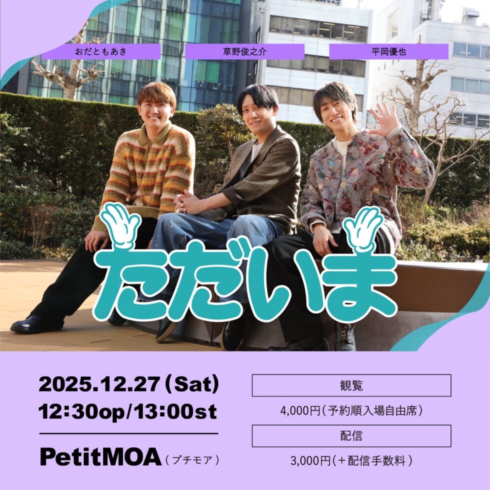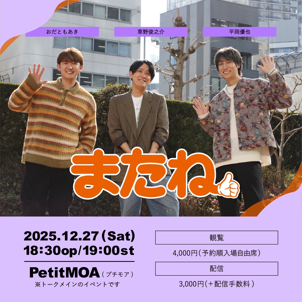 会場 : PetitMOA (プチモア) 時間 : 12:30op / 13:00st 出演 : おだともあき / 平岡優也 / 草野俊之介 料金 : 【観覧】 4,000円 (予約順入場自由席) https://tiget.net/events/434759
