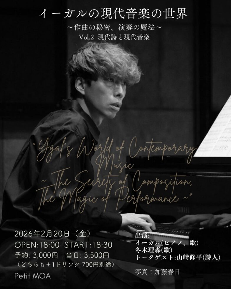 日程: 2026年2月20日(金) 出演: イーガル(ピアノ、歌)、冬木理森(歌) トークゲスト:山﨑修平(詩人) 時間: 開場 18:00/開演 18:30 会場: PetitMOA (東新宿) 料金: 予約3,000円 当日3,500円 (どちらも+1ドリンク 700円別途)