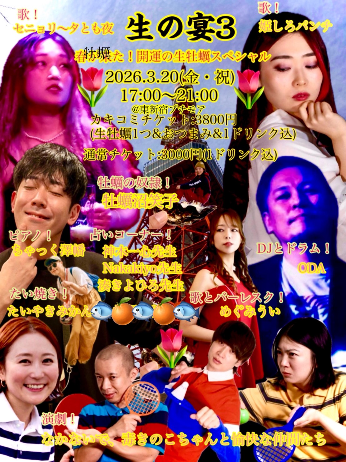 去年の夏から始まった『生の宴』いよいよ第三弾です! 今回はかなりお祭り感のあるラインナップとなりました。 占い界と演劇界とたい焼き界からお越しいただく方々がおります。 これはどういうことかと言いますと、牡蠣を食べながら占ってもらえる!牡蠣を食べながら演劇が見られる!牡蠣を食べながらたい焼きも食べられる!ということです。 フェスです。 プチモアの中はどうなってしまうのか?!